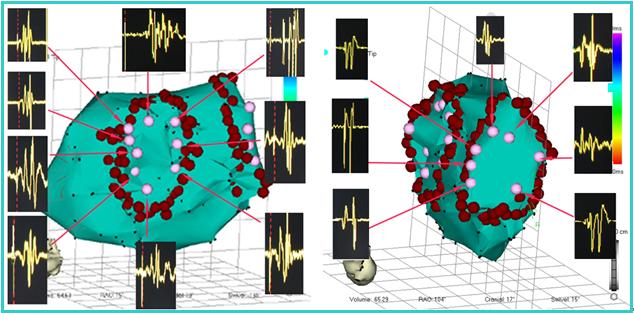 图9 “全球卫星定位系统”--CARTO引导下,重建左心房的三维电位图并进行环肺静脉线性消融。天蓝色代表左心房的三维电位图,红色的点表示环肺静脉消融的点。
