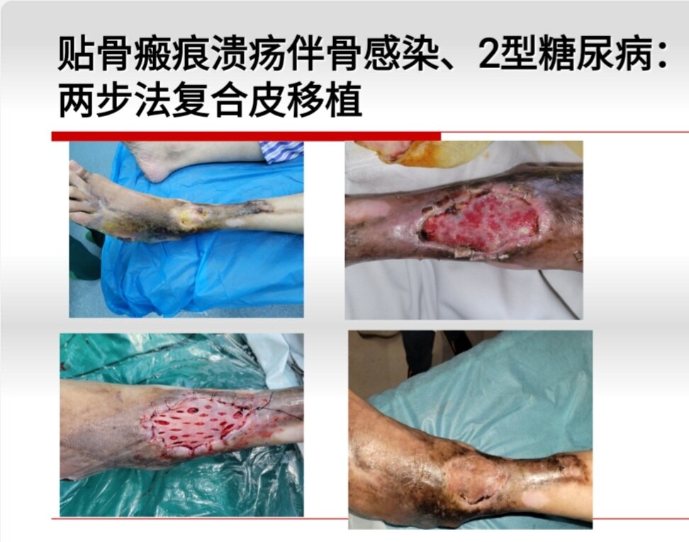 该患者为30余年的贴骨瘢痕溃疡,合并胫骨外露、骨感染。因为局部软组织没有合适的皮瓣移植受区条件,最终采用人工真皮+自体皮移植,修复创面。术后8月随访效果极佳。