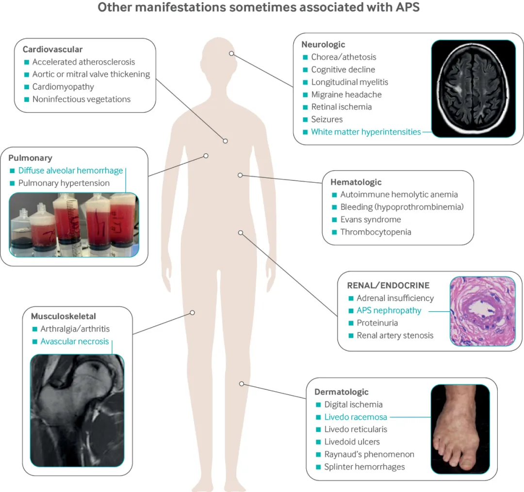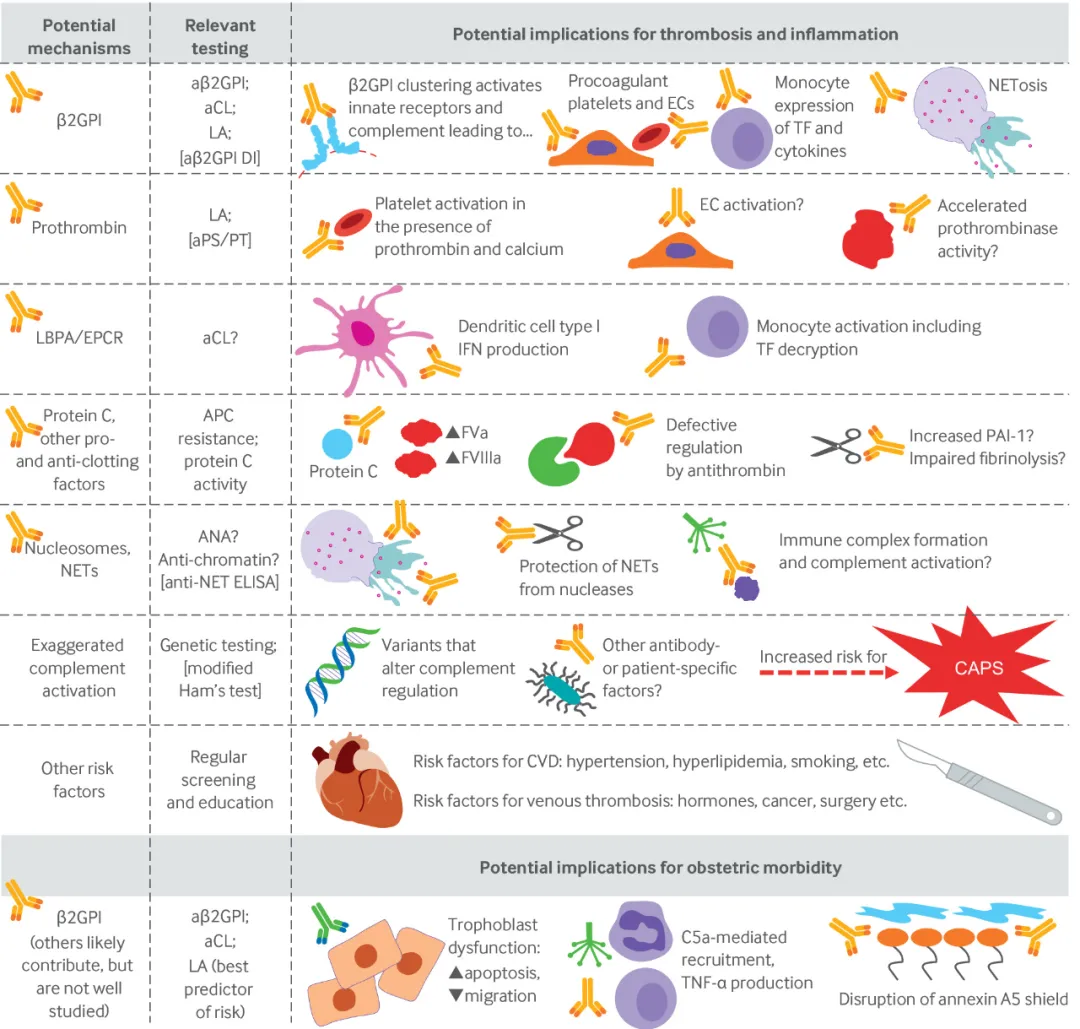 抗磷脂综合征(APS)是一种已知的具有动脉血栓形成风险的获得性血栓形成性疾病,因此可考虑根据更新的札幌(也称为悉尼)标准对所有无明确病因的患者进行检测 。对于动脉血栓形成和抗磷脂抗体(APLAs)阳性但不符合 APS 悉尼标准(例如,低滴度 APLA,仅在 1 次检测中呈阳性)的患者,应与类似血栓事件的无 APLA 阴性患者以相同的方式进行管理。对于确诊为 APS 的患者,最佳的抗血栓策略存在争议;可以考虑抗凝治疗、抗血小板治疗或两者的联合治疗。一些专家倾向于在出血风险低的患者中使用联合治疗,基于一项小型随机试验,该试验表明,与单独使用阿司匹林相比,华法林(目标国际标准化比率[INR] 2-3)加每日 100 毫克阿司匹林可降低中风复发的发生率,并且出血发生率相似。当使用抗凝治疗时,鉴于两项试验表明利伐沙班与华法林相比动脉血栓形成的风险增加,因此首选华法林。然而,鉴于上述两项试验主要纳入了三阳性的患者,并且存在重要的方法学局限性,关于是否所有具有抗磷脂综合征(APS)的患者都需要华法林,而不仅仅是那些具有高血栓形成风险特征(三阳性)的患者,仍存在争议。尽管一些专家通常倾向于为 APS 患者使用华法林进行抗凝治疗,但可考虑在单阳性或双阳性患者中使用直接口服抗凝剂(DOACs),且这些患者(1)已经耐受 DOAC 超过一年,(2)难以忍受华法林的局限性(例如,INR 波动,无法遵守定期监测),或(3)由于存在狼疮抗凝剂而 INR 无效。然而,鉴于现有数据的局限性,与患者进行知情讨论以及纳入患者偏好是抗凝剂选择的重要部分。