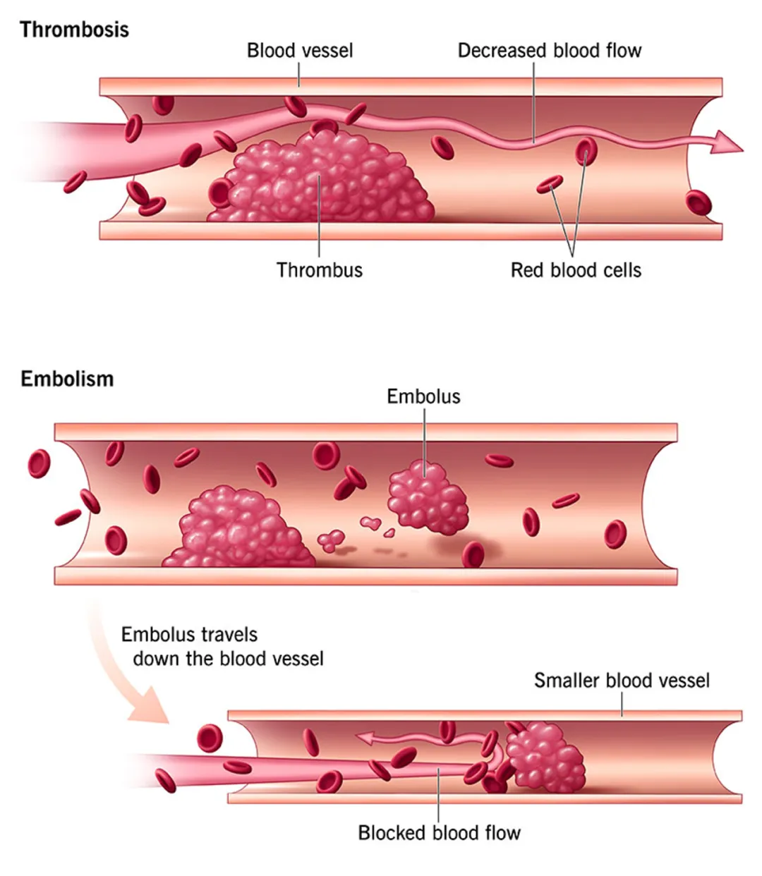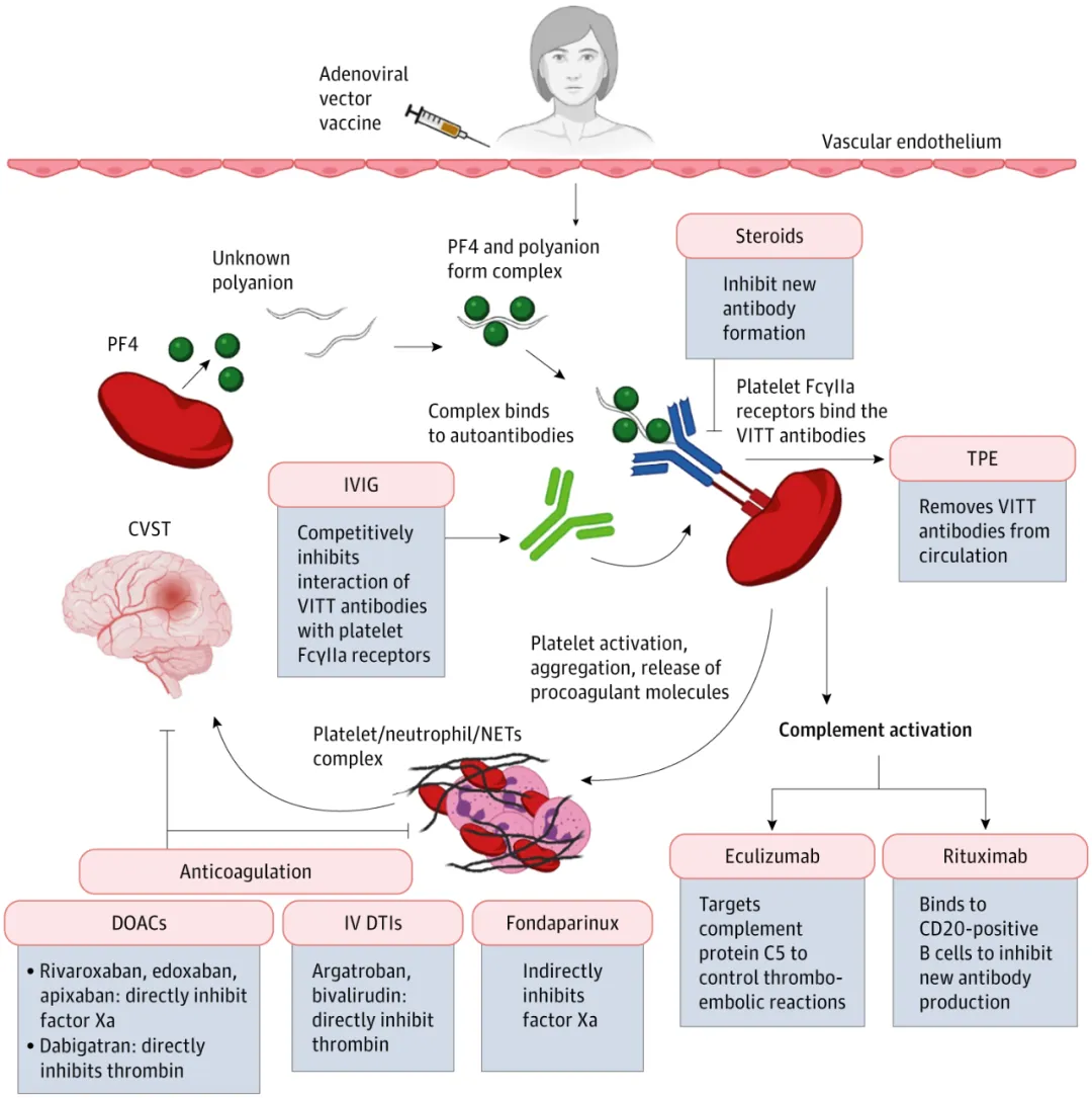 新数据表明,感染严重急性呼吸综合征冠状病毒 2 型与血栓风险增加有关,已在多个动脉部位报告了相关病例。阿斯利康和强生公司生产的 COVID-19 疫苗也已被证明会导致一种类似肝素诱导的血小板减少症的前血栓综合征,称为血栓性血小板减少症综合征(TTS)或疫苗诱导的免疫血栓性血小板减少症(VITT)。TTS/VITT 表现为血小板减少和主要为中心静脉窦血栓形成,但也有报道称其可导致动脉血栓形成。应考虑详细询问潜在的 COVID-19 暴露史、疫苗接种时间及制造商、进行 COVID-19 检测以及血小板计数(如果怀疑 TTS/VITT)。