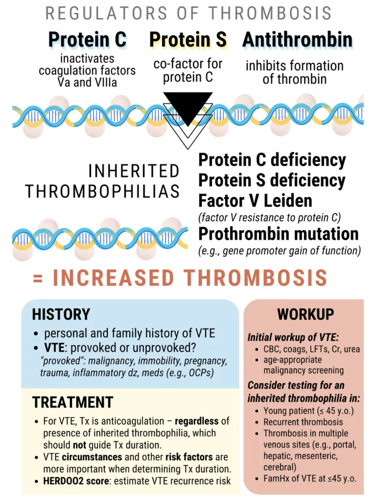 遗传性血栓性疾病和动脉血栓形成之间的关系还没有很好地表征。鉴于较强的遗传性血栓形成的罕见性及其在动脉血栓形成中的可疑作用,可考虑在对年轻患者(年龄小于50-55岁)的其他原因进行广泛评估后进行检测,特别是如果有静脉或动脉血栓形成的家族史。如果进行检测,可考虑评估蛋白C缺乏、蛋白S缺乏、抗凝血酶缺乏、因子V Leiden突变和凝血酶原20210突变。检测V Leiden因子和凝血酶原20210仅用于鉴别纯合子或复合杂合子患者,因为分离的杂合子性与动脉血栓形成风险没有临床显著相关性。重要的是,在急性血栓发作和抗凝期间,一些测定是不准确的,因此了解测定的局限性是必要的,以确保适当的采集时间和正确的解释。确定的遗传性血栓患者的抗血栓药物选择同样没有数据指导。考虑在低出血风险的患者中使用抗凝,每日加或不加阿司匹林81mg,但要定期评估风险/获益并考虑新发表的数据。