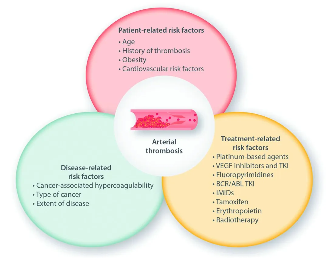恶性肿瘤患者在诊断前5个月内发生动脉血栓形成的风险增加,其中1个月前风险最高。应进行全面的病史询问和恶性肿瘤体征的体格检查,并根据年龄(如结肠镜检查、乳房x线检查)和危险因素(如对吸烟患者进行低剂量胸部计算机断层扫描)进行癌症筛查。目前尚未对动脉血栓栓塞患者进行更广泛影像学检查的益处进行研究。然而,由于癌症导致的动脉事件罕见,而且即使在静脉血栓栓塞患者中也无获益,因此该疗法不太可能有益。